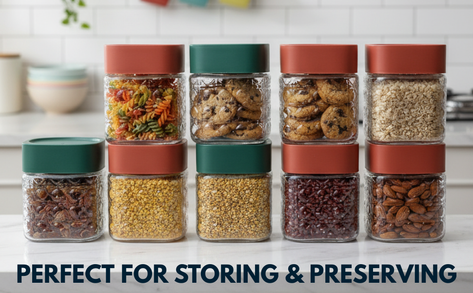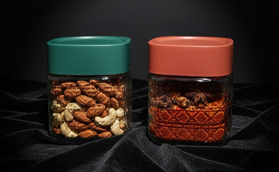 The airtight plastic lids in attractive red and green colours create a secure seal to protect cereals, grains, pulses, dry fruits, nuts, pasta, and snacks from moisture and air exposure. The 750ml capacity makes them ideal for daily-use food storage while maintaining a clean, organised look.