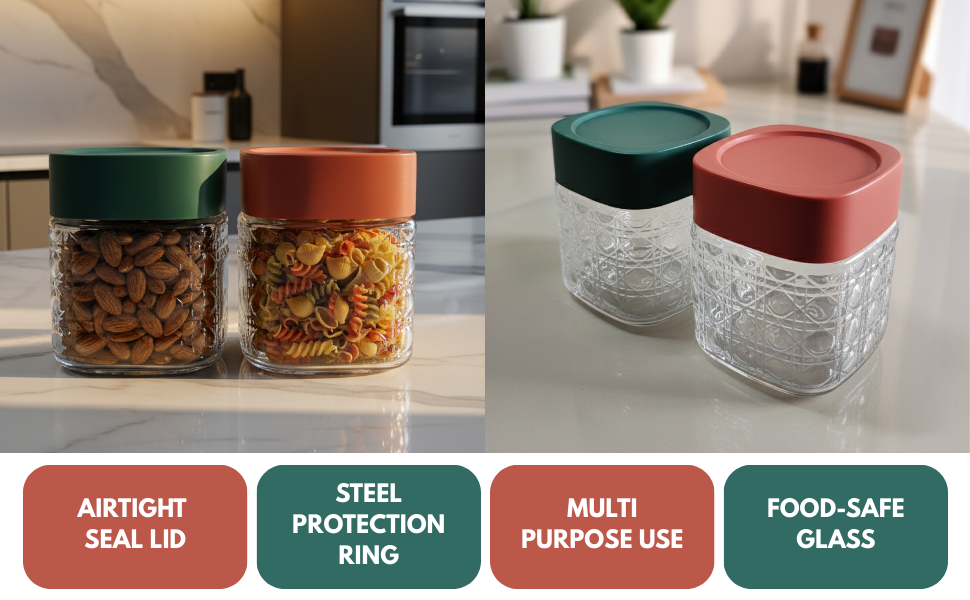 The airtight plastic lids in attractive red and green colours create a secure seal to protect cereals, grains, pulses, dry fruits, nuts, pasta, and snacks from moisture and air exposure. The 750ml capacity makes them ideal for daily-use food storage while maintaining a clean, organised look.