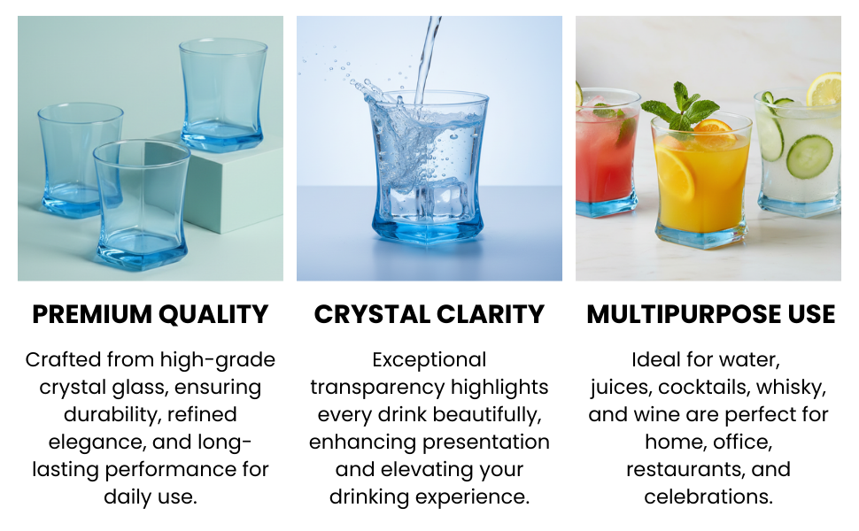 Elevate your drinking experience with the Silicox Modern Blue Drinking Glass Set, a perfect blend of style and functionality. This set of transparent glasses, each with a 260ml capacity, is designed to enhance your enjoyment of water, juice, whisky, cocktails, soda, mocktails, wine, and scotch. Whether you’re hosting a party, enjoying a quiet evening at home, or serving guests at your cafe or restaurant, these versatile glasses are the ideal choice.